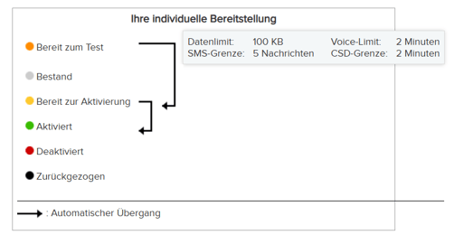 Eine SIM-Karte kann sich in verschiedenen Status befinden. Im Status "Test Ready" können Sie bis zu 100KB kostenfreies Testvolumen nutzen.